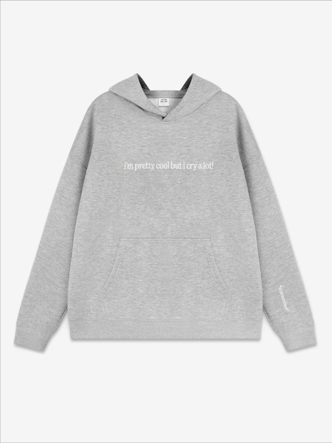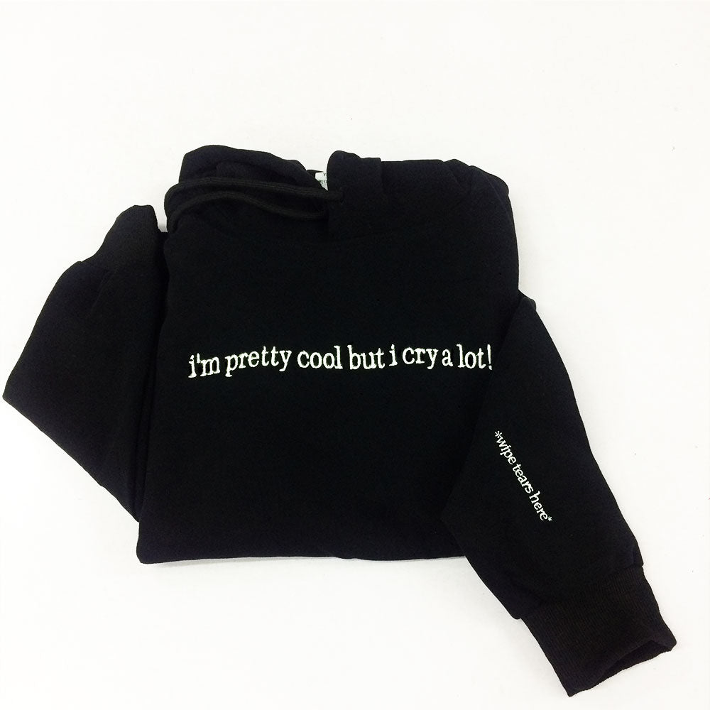 - Embroidered design on chest that reads "I'm pretty cool, but I cry a lot!"