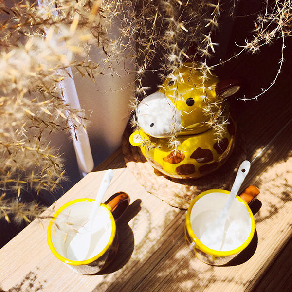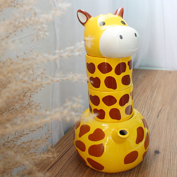 We're sure your new friends will enjoy chatting with you while sipping on your favorite beverage with our Giraffe Pot And Mug Set. This set includes a pot, two mugs, and a lid. If you stack them up, you'll get a cute giraffe. It also comes with a white spoon. It'll add a touch of fun to your table.