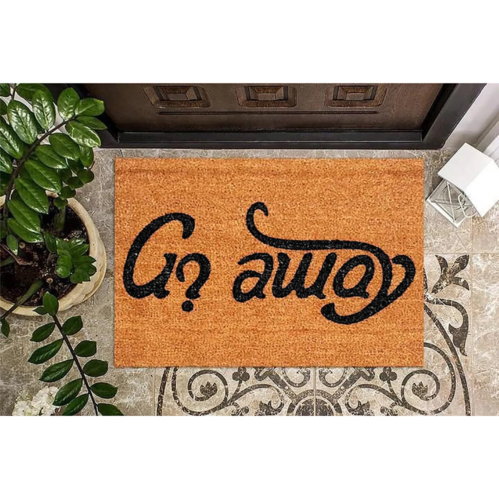 This is a unique door mat that can be used to look in and walk away from which direction. Welcome to greet your guests with a guest mat and be pleasantly surprised when they read Go-Away on the same door mat when they leave home.